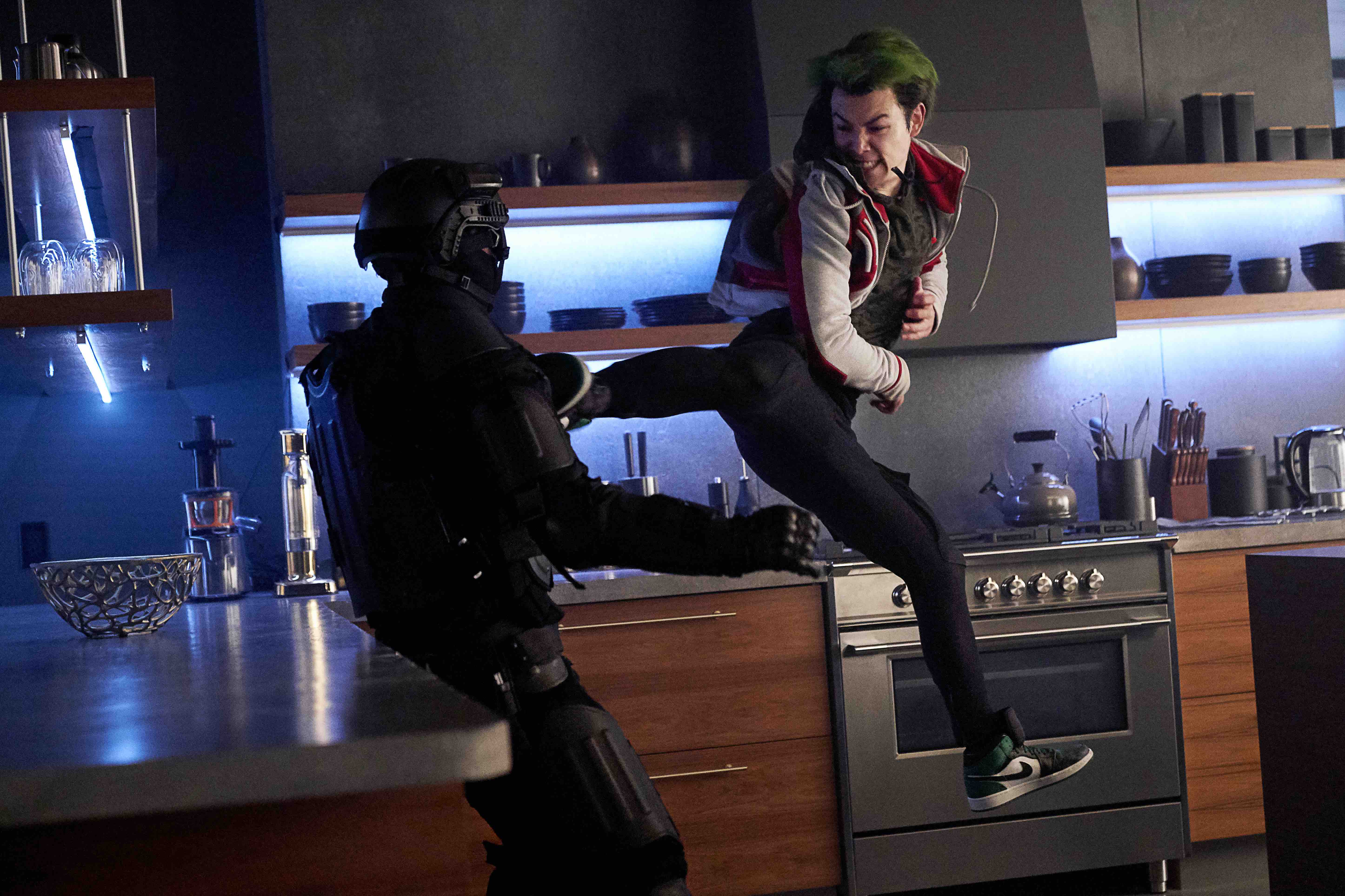 Outras imagens mostram Gar (Ryan Potter) e Conner (Joshua Orpin) na Torre dos Titãs enfrentando invasores.